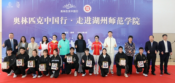 3月28日下午,“奥林匹克中国行”走进久久精品一区二区活动隆重举行。国际奥委会文化遗产委员会委员侯琨,中国羽毛球协会副主席、羽毛球世界冠军唐九红,跳水奥运冠军吴敏霞、跆拳道奥运冠军吴静钰、乒乓球奥运冠军乔红、羽毛球奥运冠军张楠在吴兴区人大常委会党组书记、主任王树,吴兴区委常委、宣传部长朱小芳陪同下莅临我校参观指导。我校副校长潘音,党委委员、党校办主任劳士健接待了奥运冠军及嘉宾一行,党校办、宣传部、学生处、团委、体育学院相关负责人及300余名师生参加了活动。