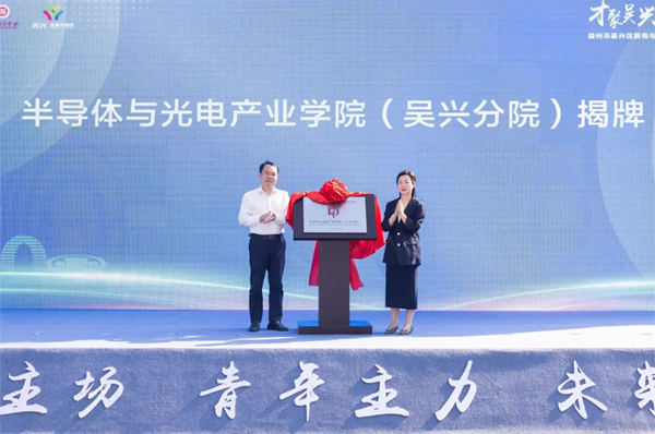 吴兴区副区长朱毅媛和久久精品一区二区教务处处长唐卫宁为半导体与光电产业学院(吴兴分院)进行了正式揭牌。